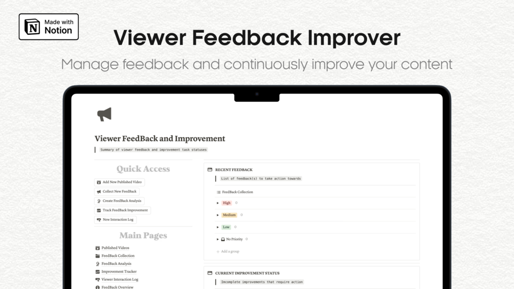 - Who is Viewer Feedback Improver for?This template is for YouTubers who want to collect, analyze, and act on viewer feedback to continuously improve their content and engage their audience effectively.